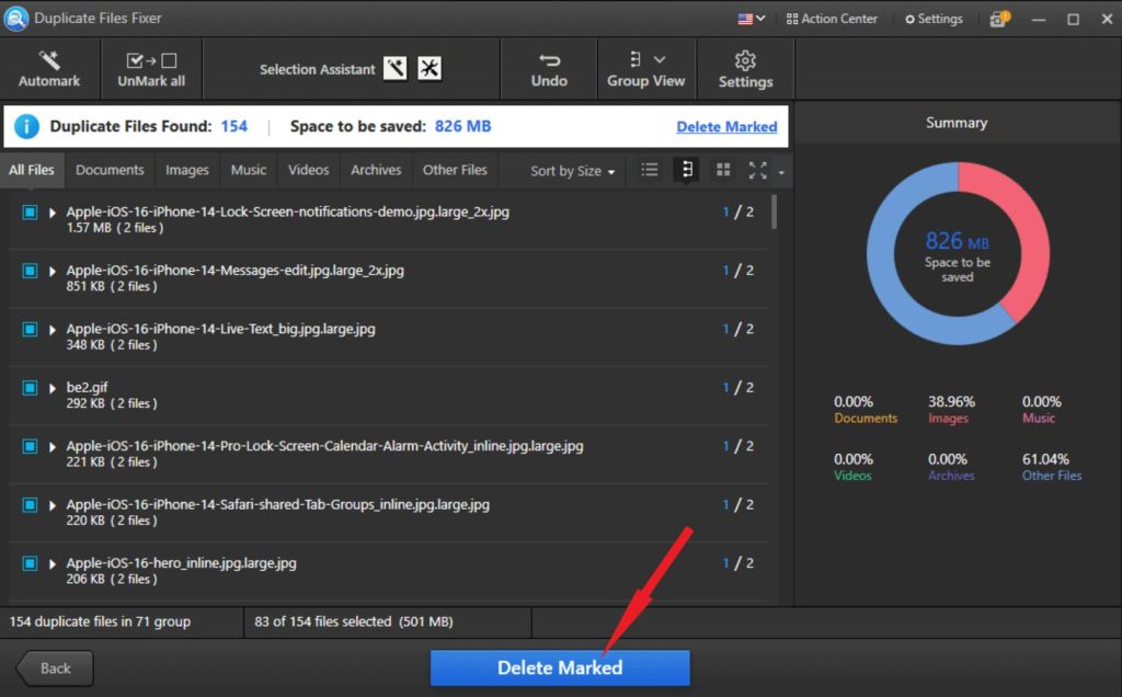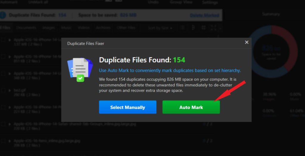 Krok 4:Po pomyślnym zakończeniu skanowania zostanie wyświetlona opcja ręcznego usunięcia duplikatów lub za pomocą wygodnej funkcji „Auto Mark”. Aby usprawnić proces za pomocą czyszczenia jednym kliknięciem, po prostu kliknij„Znak samochodu”.