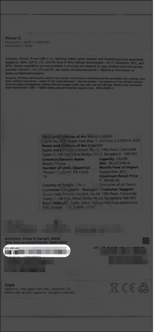 Jeśli masz oryginalne pudełko, w którym otrzymałeś iPhone'a, możesz zobaczyć identyfikator EID wydrukowany na etykiecie z tyłu pudełka.