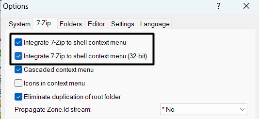 3.W sekcji 7-Zip upewnij się, żeZintegruj menu kontekstowe powłoki 7-ZipIZintegrować Menu kontekstowe powłoki 7-Zip (32-bitowe)pola wyboru są zaznaczone.