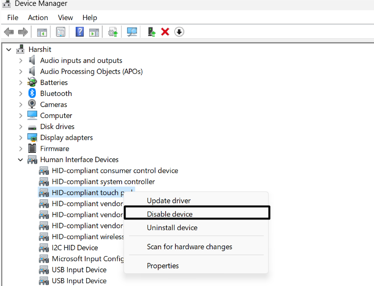 3.Kliknij prawym przyciskiem myszySterownik touchpada zgodny z HIDi z menu wybierzWyłącz urządzenie.