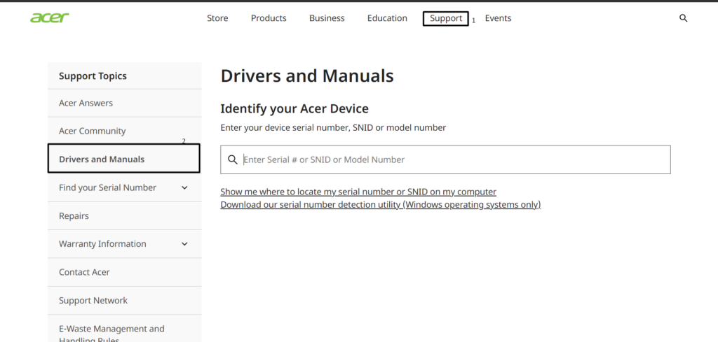 2.Po zakończeniu przejdź doOficjalna strona Acerai przejdź doWsparcie>Sterowniki i instrukcje.