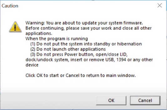 6.Na koniec przeczytaj treść wOstrożnośćpodpowiedź. Po zakończeniu wybierzOKprzycisk wOstrożnośćaby rozpocząć proces aktualizacji BIOS/oprogramowania sprzętowego i ponownie uruchomić laptopa.