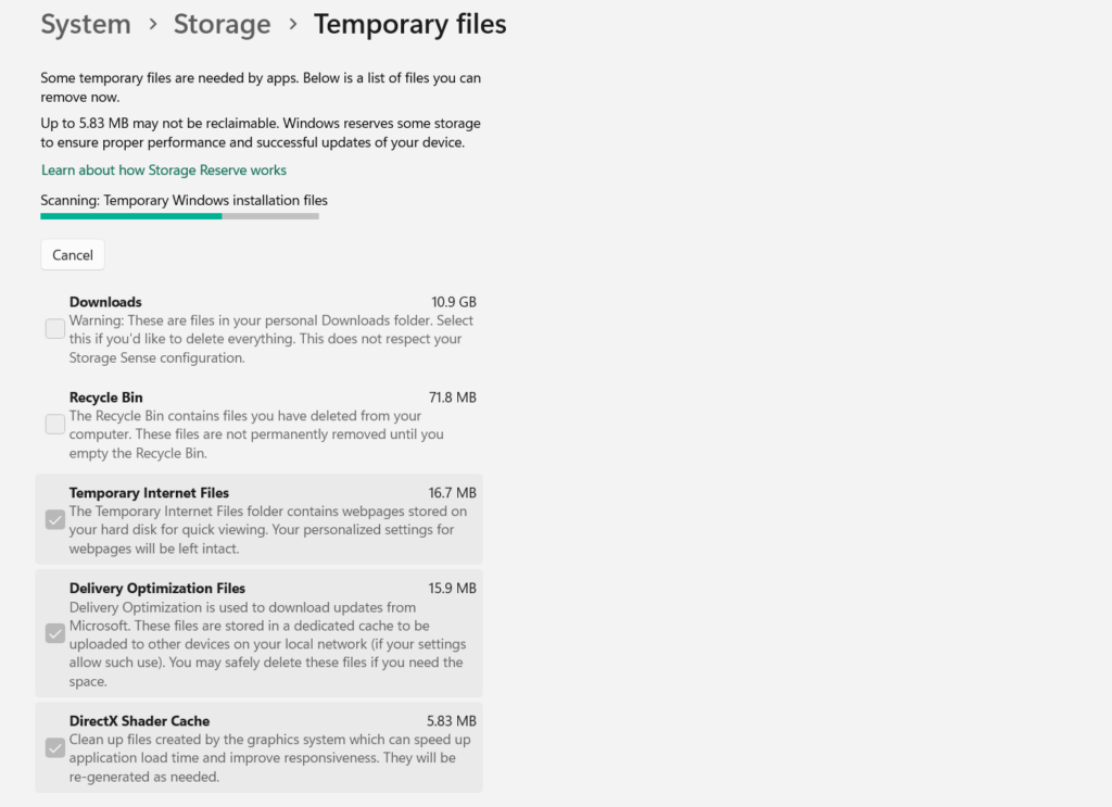 3.WybierzPliki tymczasoweopcję i pozwól systemowi Windows przeskanować w poszukiwaniu zbędnych plików, aby zwolnić trochę miejsca.