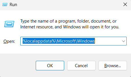 2.Skopiuj i wklej %localappdata%MicrosoftWindows w plikuBiegnijpole wyszukiwania. W przeciwnym razie przejdź do wspomnianej lokalizacji w plikuNarzędzie Eksplorator plikówaby uzyskać dostęp do pliku Usrclass na swoim urządzeniu: