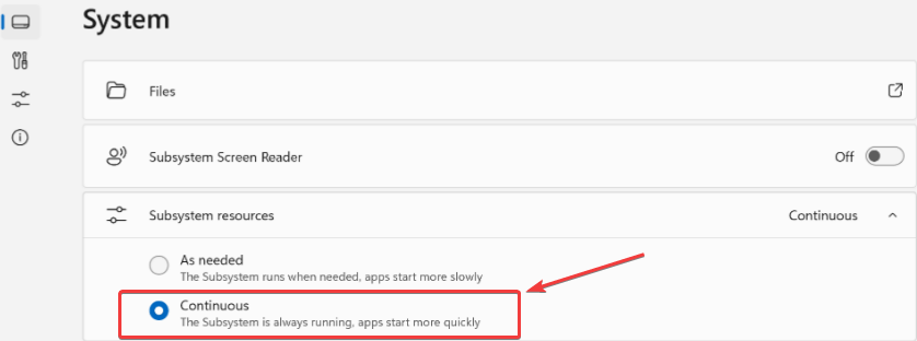 Innym rozwiązaniem, które może się sprawdzić w przypadku, gdy aplikacje na Androida nie działają na komputerze z systemem Windows, jest ustawienie zasobów WSA na ciągłe. Oto kroki prowadzące do tego samego –