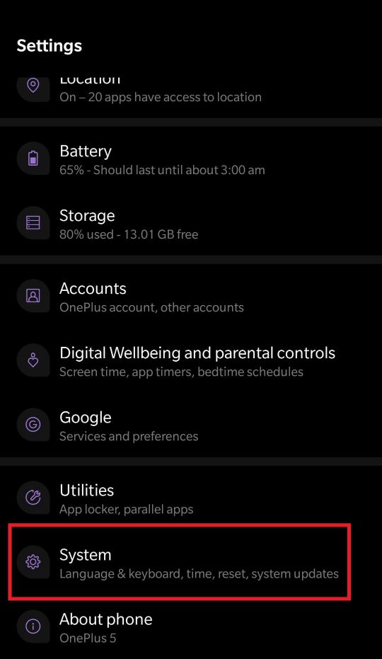 Krok 2:Przewiń w dół i dotknijSystem lub Informacje o telefonie.(Różni się w zależności od urządzeń)