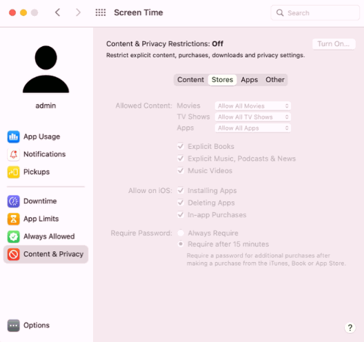 4. Z lewej stronyCzas ekranowyoknie, znajdź i kliknijTreść i prywatność.