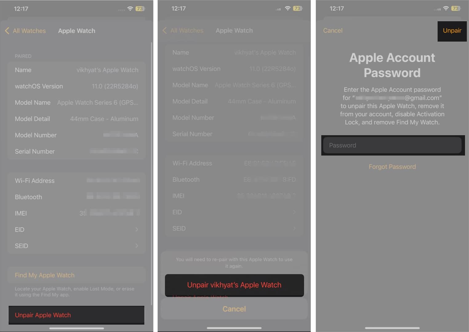 Aby rozparować Apple Watch i iPhone'a, otwórz plikOglądaćaplikacja. Następnie przejdź doWszystkie zegarki, dotknijIprzycisk i naciśnijRozparuj zegarek Apple Watchna dole. Aby zakończyć, postępuj zgodnie z instrukcjami wyświetlanymi na ekranie.