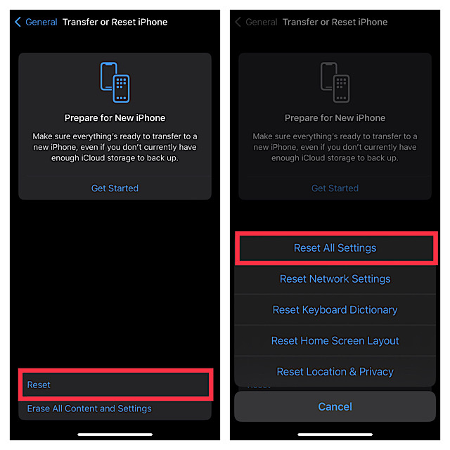 - Przejdź do aplikacji Ustawienia na swoim iPhonie -> Ogólne -> Przewiń w dół i dotknij Transfer lub Zresetuj iPhone'a -> Resetuj -> Resetuj wszystkie ustawienia.