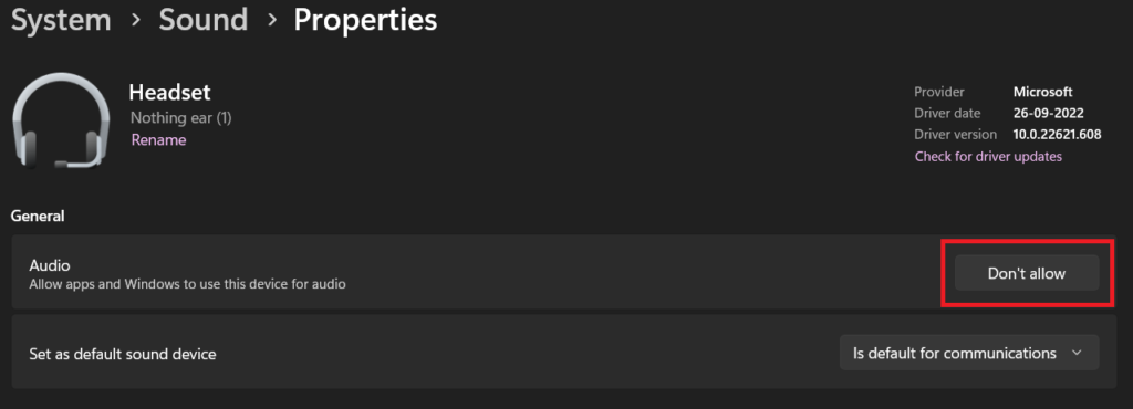 4.wSekcja wejściowa, kliknij nazwę swoich słuchawek. Następnie kliknijNie zezwalajprzycisk obokAudioopcję ograniczenia komputerowi możliwości używania tego urządzenia jako urządzenia wejściowego audio.