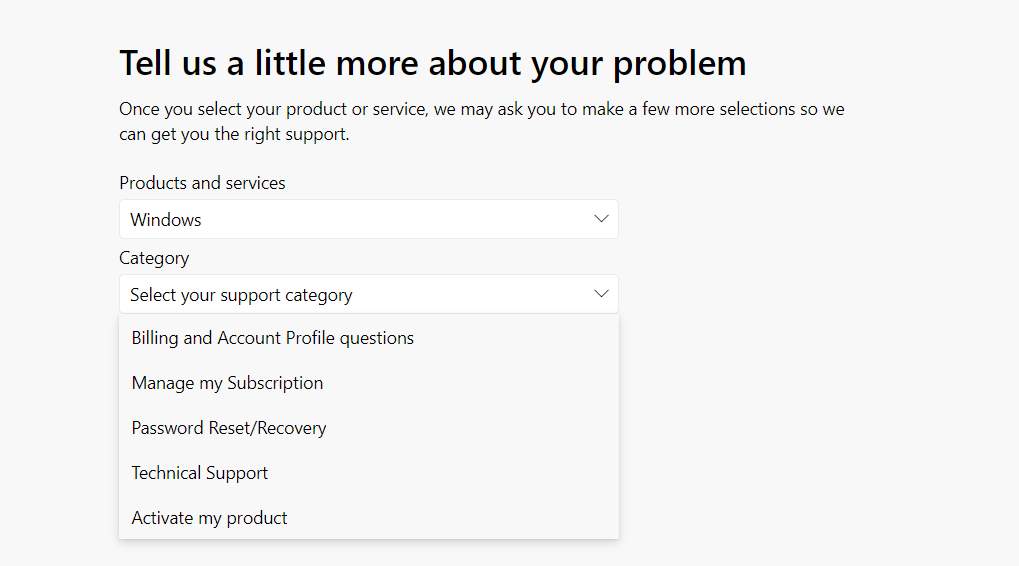 4.WybieraćProblemwWybierz kategorięsekcję, a następnie wybierz problem z listy rozwijanej.