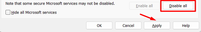 4.Po ukryciu wszystkich usług Microsoft wybierzWyłącz wszystkoaby wyłączyć wszystkie aplikacje innych firm.