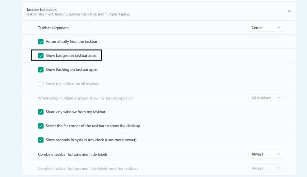 2.W tej samej sekcji wyłączPokazuj plakietki w aplikacjach na pasku zadańaby wyłączyć plakietki na pasku zadań.