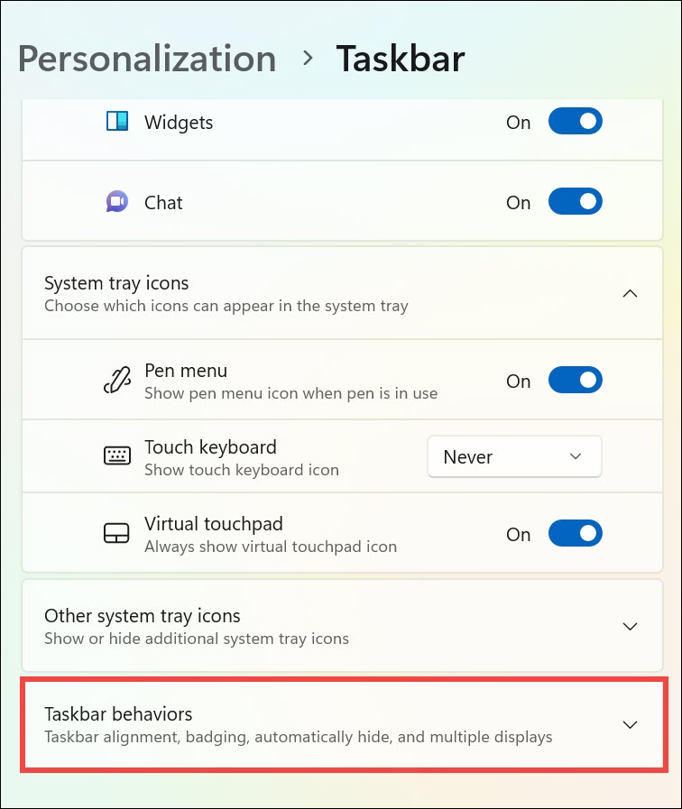 2.wPersonalizacjaokno, rozwińPasek zadańsekcję, klikając ją, a następnie wybierzZachowania paska zadań.