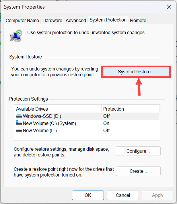 1.UruchomNarzędzie Właściwości systemui kliknijPrzywracanie systemu…przycisk podPrzywracanie systemu.
