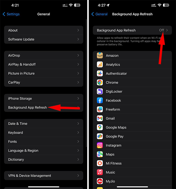 - Stuknij ponownie opcję Odśwież aplikację w tle, a następnie wybierzWyłączony. Możesz także indywidualnie wyłączyć wszystkie aplikacje, których nie chcesz odświeżać w tle.