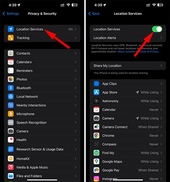 - Stuknij w przełącznik usług lokalizacyjnych, aby go wyłączyć.