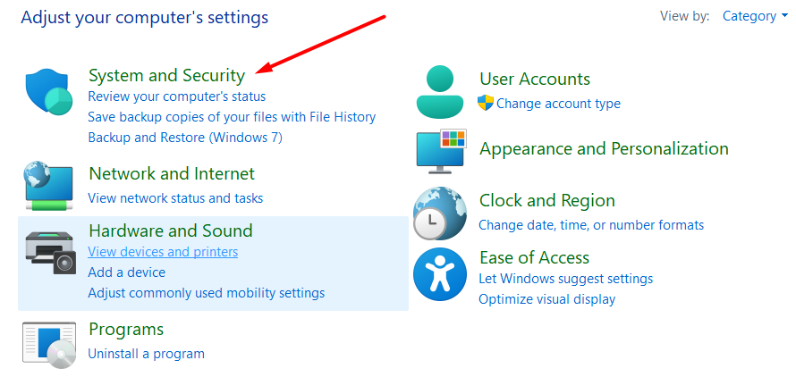 1.OtwórzPanel sterowaniaaplikację i kliknijSystem i bezpieczeństwo.