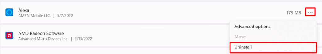 W niektórych przypadkach okazuje się, że błąd BSOD występuje z powodu aplikacji innej firmy lub instalacji nowej aplikacji innej firmy. Jeśli błąd występuje z winy oprogramowania, zawsze zalecamy usunięcie programu z systemu. Poniżej znajdują się kroki umożliwiające odinstalowanie oprogramowania z komputera z systemem Windows 11.