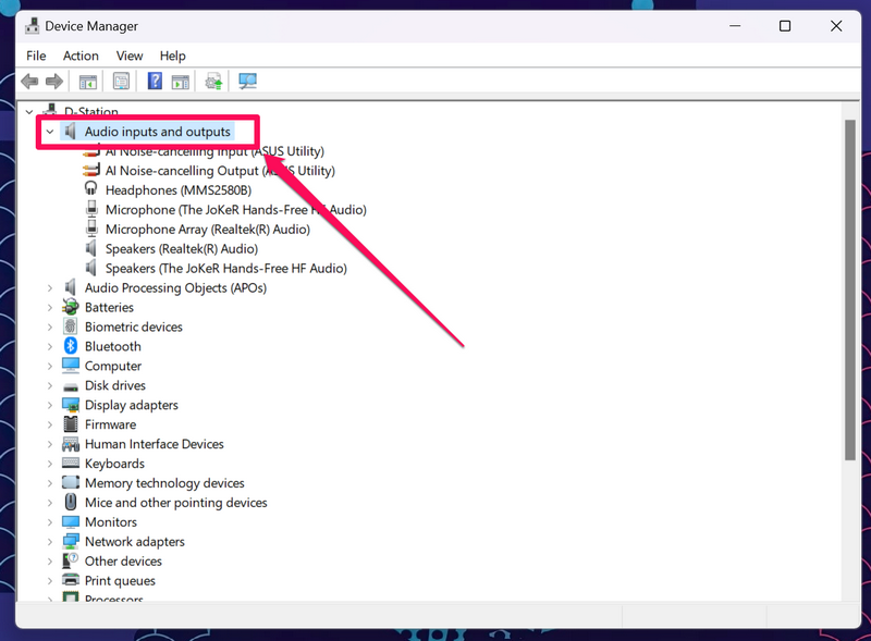 3.wMenedżer urządzeńokno, rozwińWejścia i wyjścia audioklikając małą strzałkę obok niej.