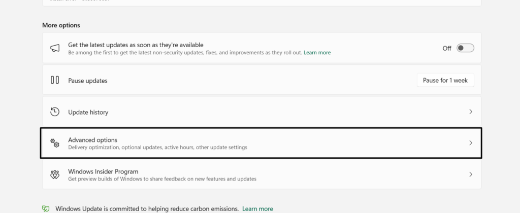 3.NaAktualizacja systemu Windowsekran, podWięcej opcjisekcję, kliknijZaawansowane opcje.