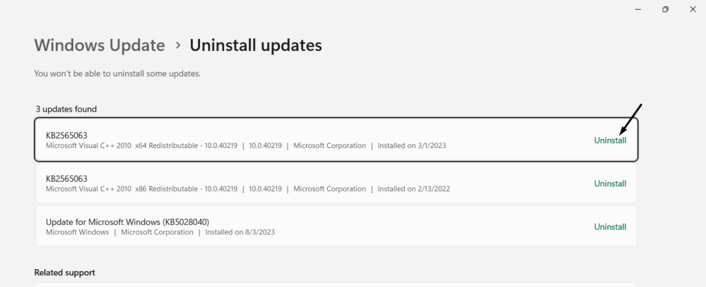 3.Na następnym ekranie poszukaj wadliwej aktualizacji i kliknij przyciskOdinstalujprzycisk obok niego.