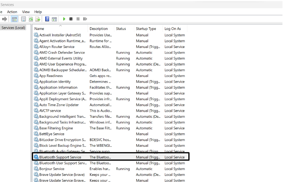 3.wUsługiokno, poszukajUsługa pomocy technicznej Bluetoothi kliknij go prawym przyciskiem myszy, aby wyświetlić menu.