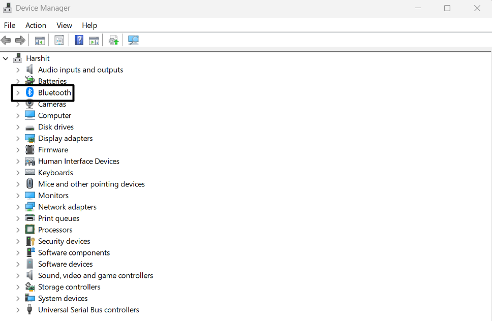 1.OtwórzAplikacja Menedżer urządzeńna komputerze z systemem Windows 11 i rozwiń plikBluetoothsekcja.