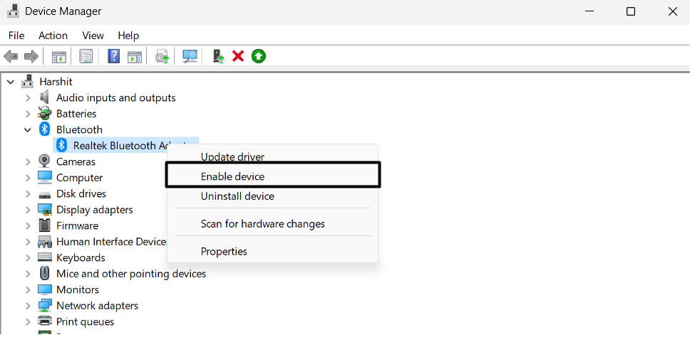 4.WybierzWłącz urządzenieopcję z tego samego menu, aby ponownie włączyć urządzenie na swoim komputerze.
