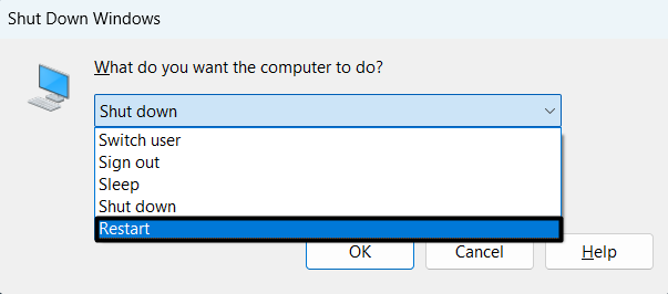 Naciśnij klawisz skrótu Alt + F4, aby otworzyćZamknij system Windowsmonit na komputerze z systemem Windows 11. Następnie wybierzUruchom ponownieopcję z menu rozwijanego monitu, aby ponownie uruchomić komputer.