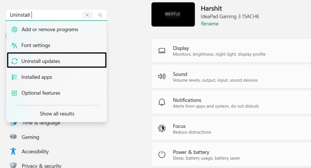 2.W lewym okienku Ustawień wpiszOdinstaluj aktualizacjew wyszukiwaniu i wybierz go z wyników.