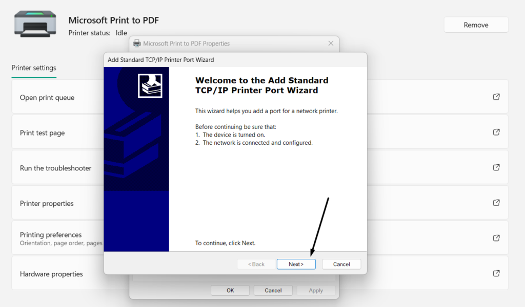 5.W nowym oknie dialogowym kliknijDalej>, a następnie wprowadź adres drukarki i nazwę portu.