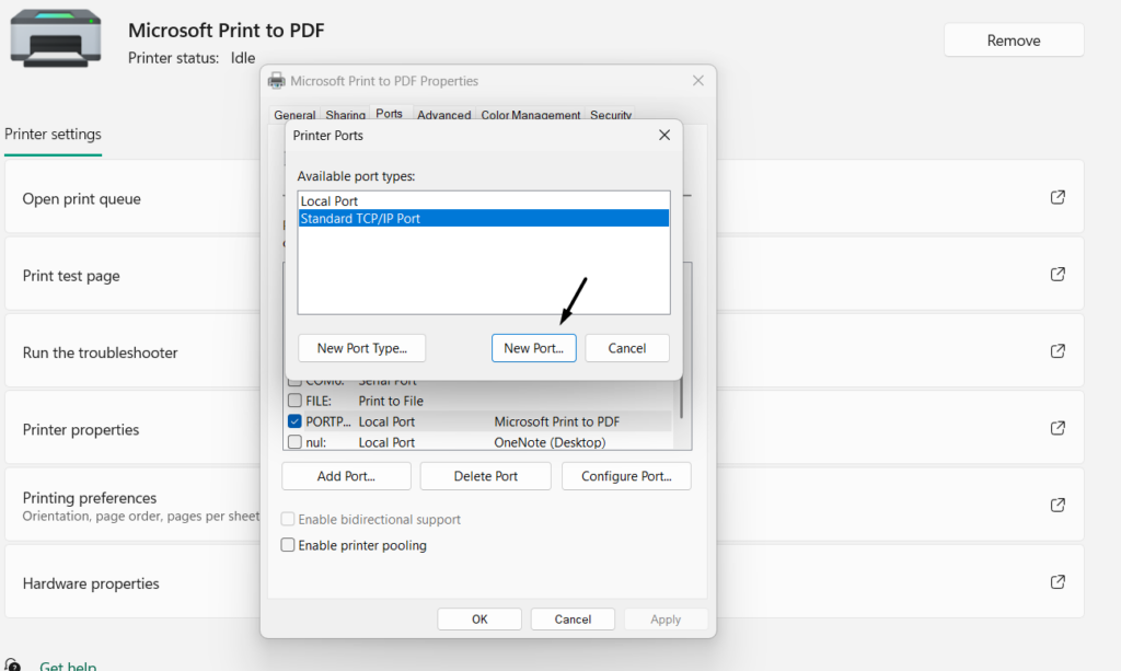 4.KliknijDodaj port…przycisk, wybierzStandardowy port TCP/IP, a następnie wybierzNowy port…
