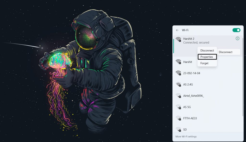 3.Na następnym ekranie kliknij prawym przyciskiem myszy swoją sieć Wi-Fi i wybierzWłaściwościz menu.