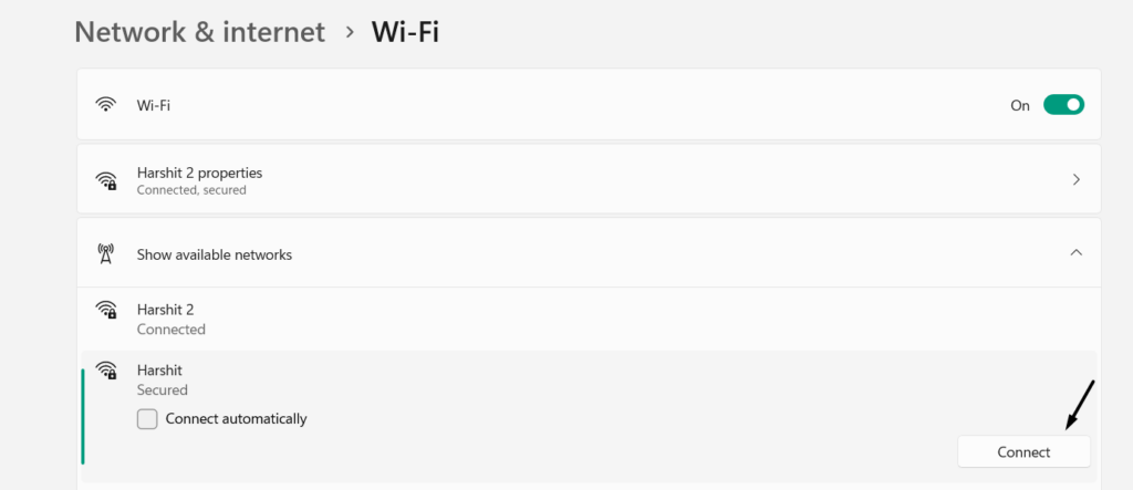 3.Na koniec kliknijŁączyćobok sieci, aby podłączyć do niej komputer stacjonarny lub laptop z systemem Windows 11.