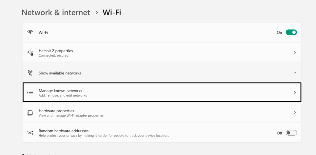 2.Na następnym ekranie wybierzWi-Fi, a następnie rozwińZarządzaj znanymi sieciamisekcja.