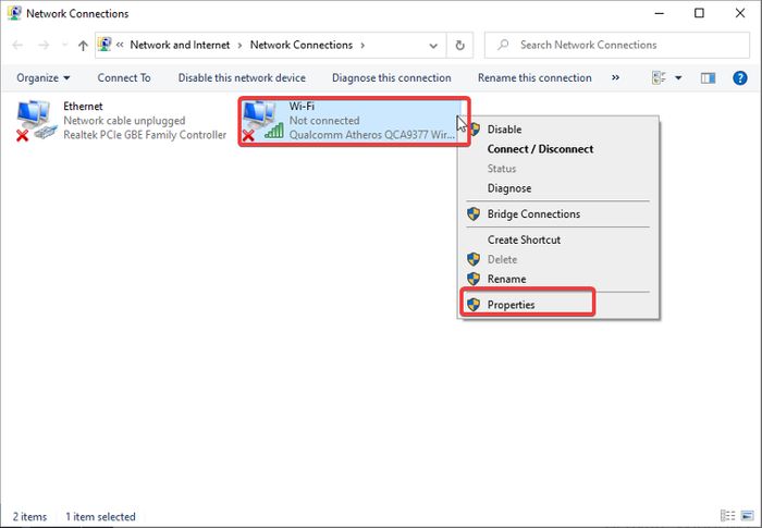 2.PodAdaptery sieciowe, kliknij prawym przyciskiem myszy sterownik Wi-Fi i wybierzWłaściwościopcja.