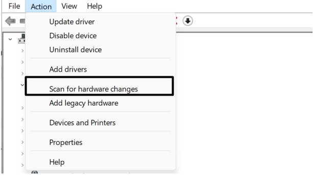 6.Po zakończeniu kliknijDziałanieu góry i z menu wybierzSkanuj w poszukiwaniu zmian sprzętowych.
