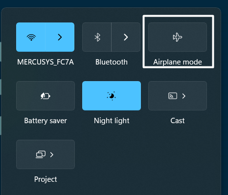 2.W Centrum szybkiej akcji kliknijTryb samolotowyaby włączyć tę funkcję na komputerze z systemem Windows 11.