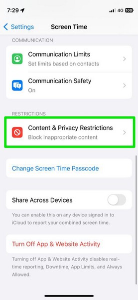 3.Przewiń w dół, aby zlokalizowaćOgraniczenia dotyczące treści i prywatnościopcja idotknij, aby otworzyćna Twoim urządzeniu.