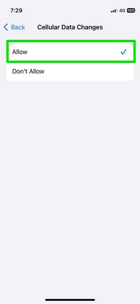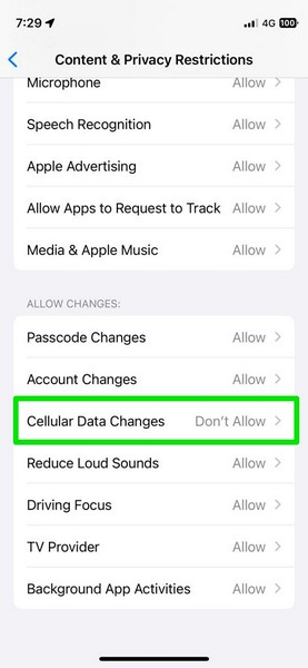 4.Tutaj przewiń w dół doZezwalaj na zmianysekcję, zlokalizujZmiany danych komórkowychopcję i dotknij jej, aby otworzyć.