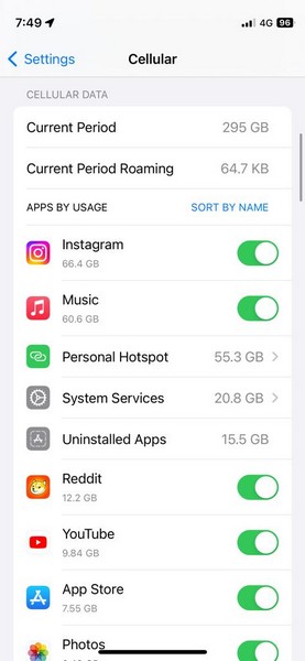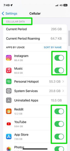 3.Teraz,przeglądaj aplikacjepodDane komórkowe sekcjana tej stronie, aby sprawdzić, czy przełącznik aplikacji, której próbujesz użyć, jest włączony, czy nie.