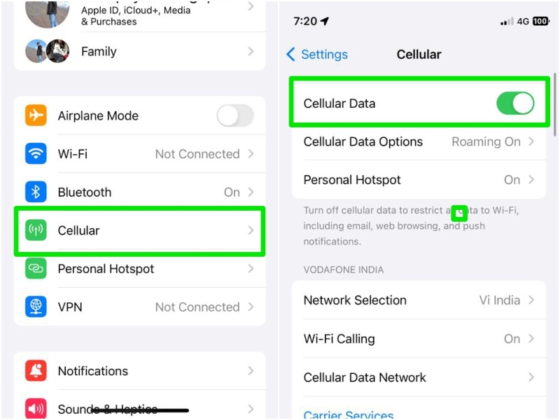 Jedną z pierwszych rzeczy, które powinieneś sprawdzić, gdy wystąpi problem z niedziałającymi danymi komórkowymi na iPhonie, jest to, czy usługa jest włączona, czy nie. Istnieją dwa sposoby sprawdzenia tego na iPhonie, oba omówiliśmy poniżej: