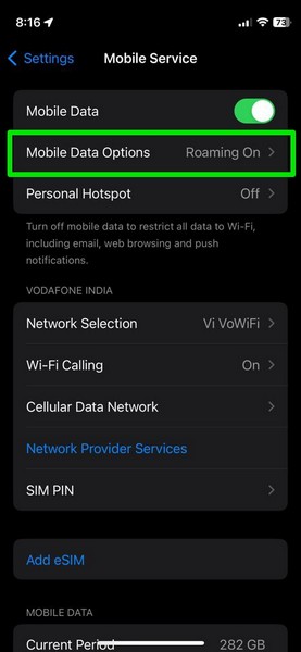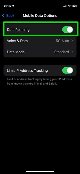 4.Tutaj upewnij się, że przełącznik dlaRoaming danychopcja jestwłączonyna Twoim urządzeniu. Jeśli tak nie jest, dotknij go, aby włączyć tę opcję.