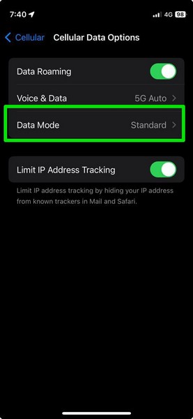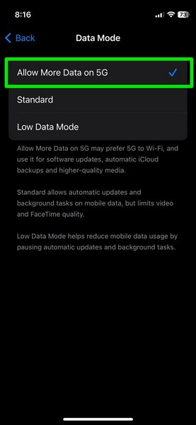 8. Ustaw opcję Zezwalaj na więcej danych w sieci 5G dla danych komórkowych