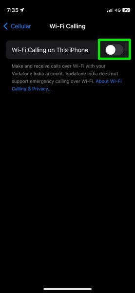 Funkcja połączeń Wi-Fi może pomóc w rozwiązaniu problemu z niedziałającymi połączeniami na iPhonie, ale czasami powoduje problemy z funkcją danych komórkowych na Twoim urządzeniu. Dlatego możesz spróbować wyłączyć tę opcję na swoim iPhonie, aby sprawdzić, czy rozwiązuje to problem niedziałania danych komórkowych na Twoim urządzeniu.