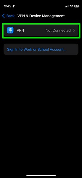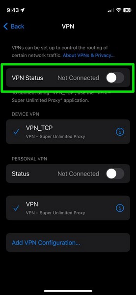 5.Upewniać sięprzełącznik stanu VPN jest wyłączonyna swoim iPhonie. Jeśli tak nie jest, dotknij przełącznika, aby wyłączyć VPN na swoim urządzeniu.