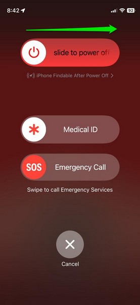 Na ekranie suwaka przytrzymaj klawiszWyłączsuwak iprzeciągnij go od lewej do prawejaby wyłączyć iPhone'a.