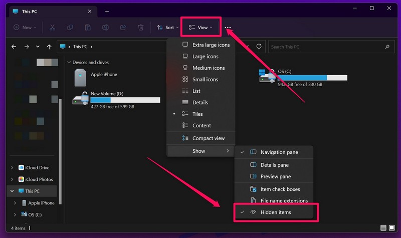 Notatka:TheDane programufolder, którego szukamy, może być tutaj ukryty. Dlatego pamiętaj, aby zaznaczyć pole Ukryte elementy w obszarzePogląd-> Pokaż menu rozwijane.