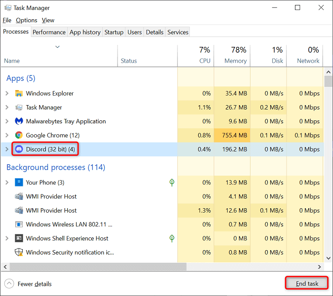 - WybieraćNiezgodana liście aplikacji i wybierzZakończ zadaniena dole. Spowoduje to zamknięcie Discorda przed usunięciem plików pamięci podręcznej.